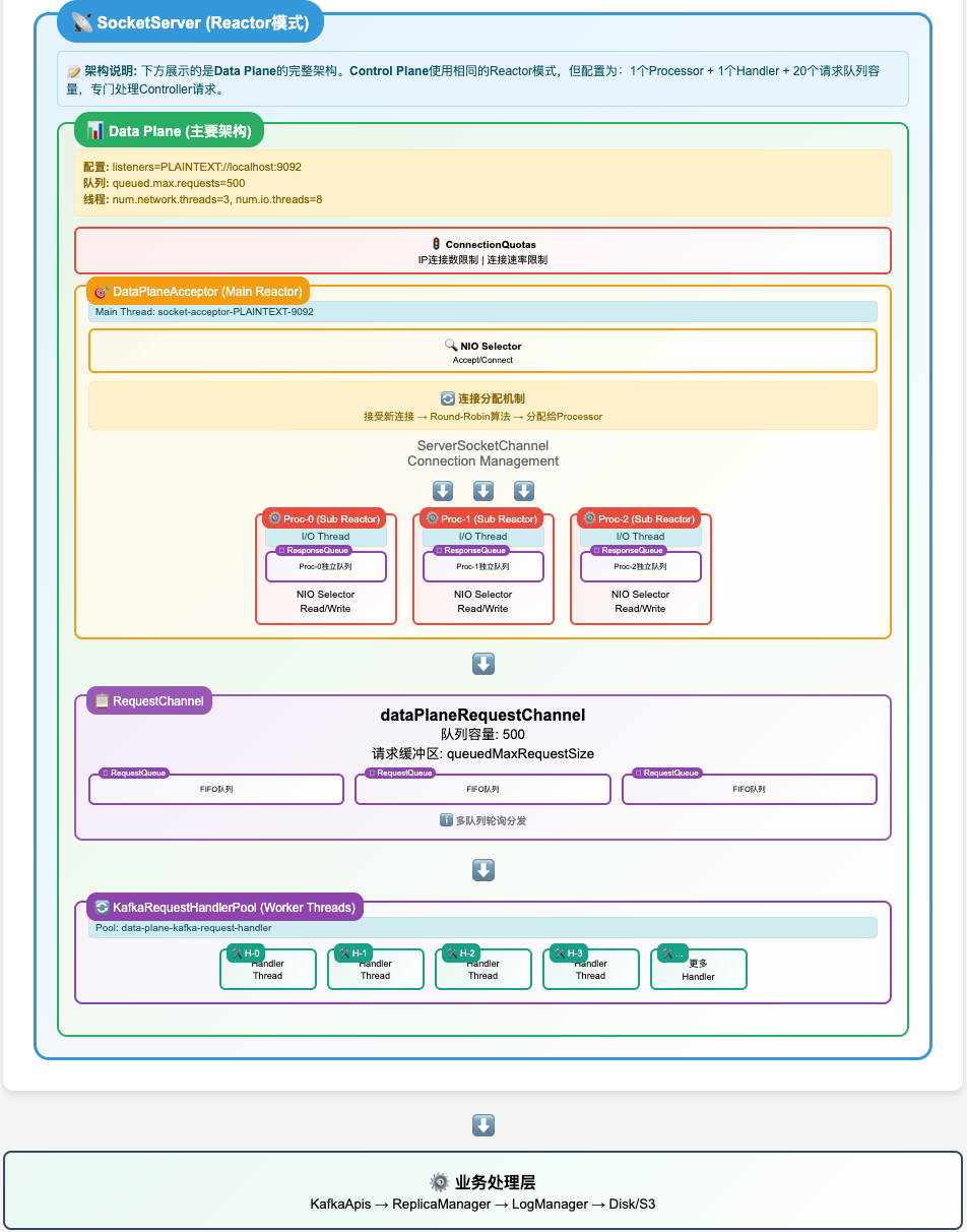AutoMQ SocketServer 采用分层解耦的 Reactor 模式,通过四层架构实现高并发网络处理: